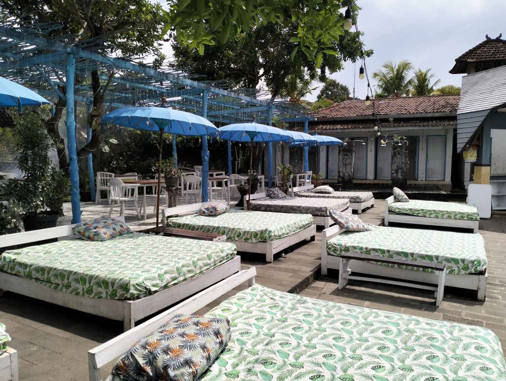 The place looks really nice, all around you will find shaded places with beanbags where you can sit and relax, there are also places where you can just sit on some kind of rug with pillows where you can relax, but there are also big sunbeds which might be more comfortable.