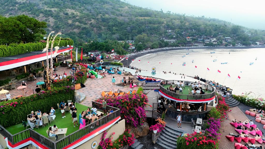 From the beach you can see the mighty Mount Agung by clear weather. The beach has black sand caused by the outburst of the Agung in 1963.