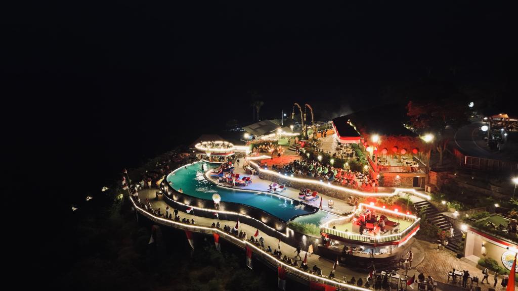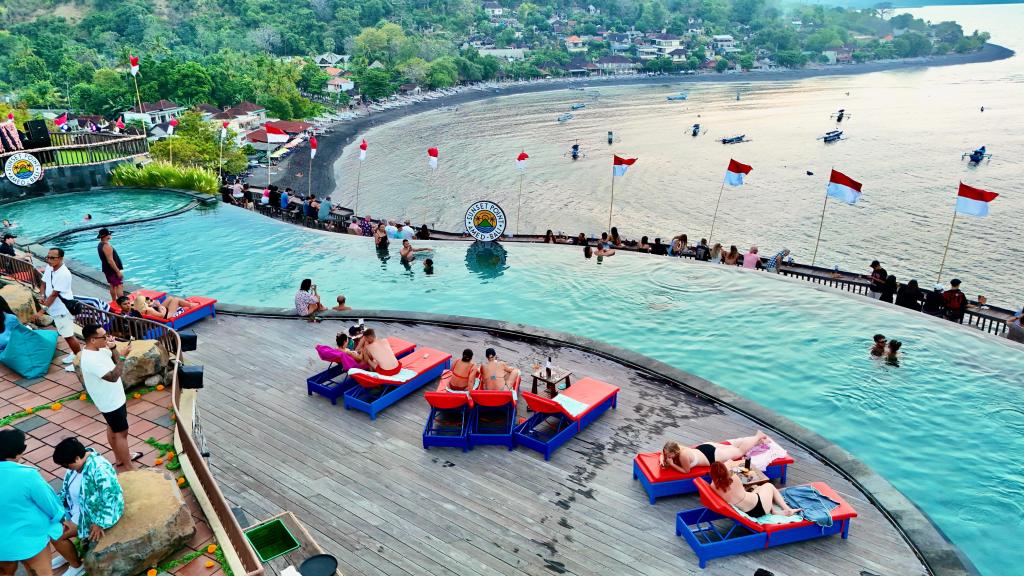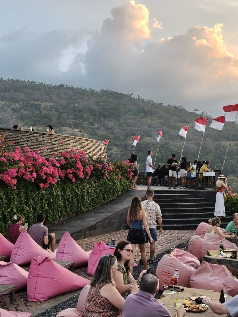 This is a fairly large complex, a beach club without a beach because it’s perched on a cliff. There’s a large parking lot for cars, and you have to register, or at least indicate what you want. There’s a buffet BBQ option, which we didn’t do because we came for the sunset. The entrance fee was IDR 150,000 per person, but the drinks are included. There’s an infinity pool and VIP terraces, all very luxurious.