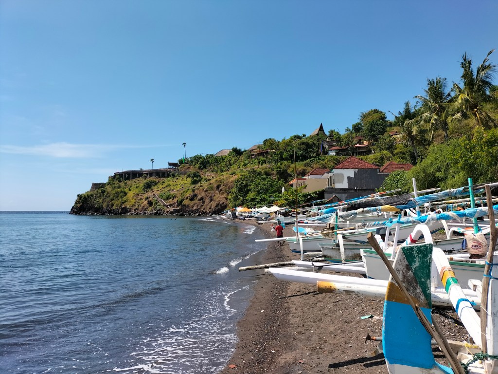 From the beach you can see the mighty Mount Agung by clear weather. The beach has black sand caused by the outburst of the Agung in 1963.