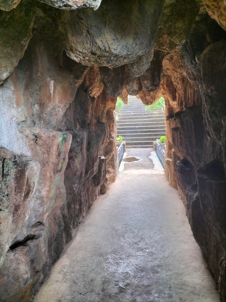 The entrance gate is impressive and the road to it promises a lot, there are beautiful statues in the carved rock walls and there is also a large statue at the crossroads.