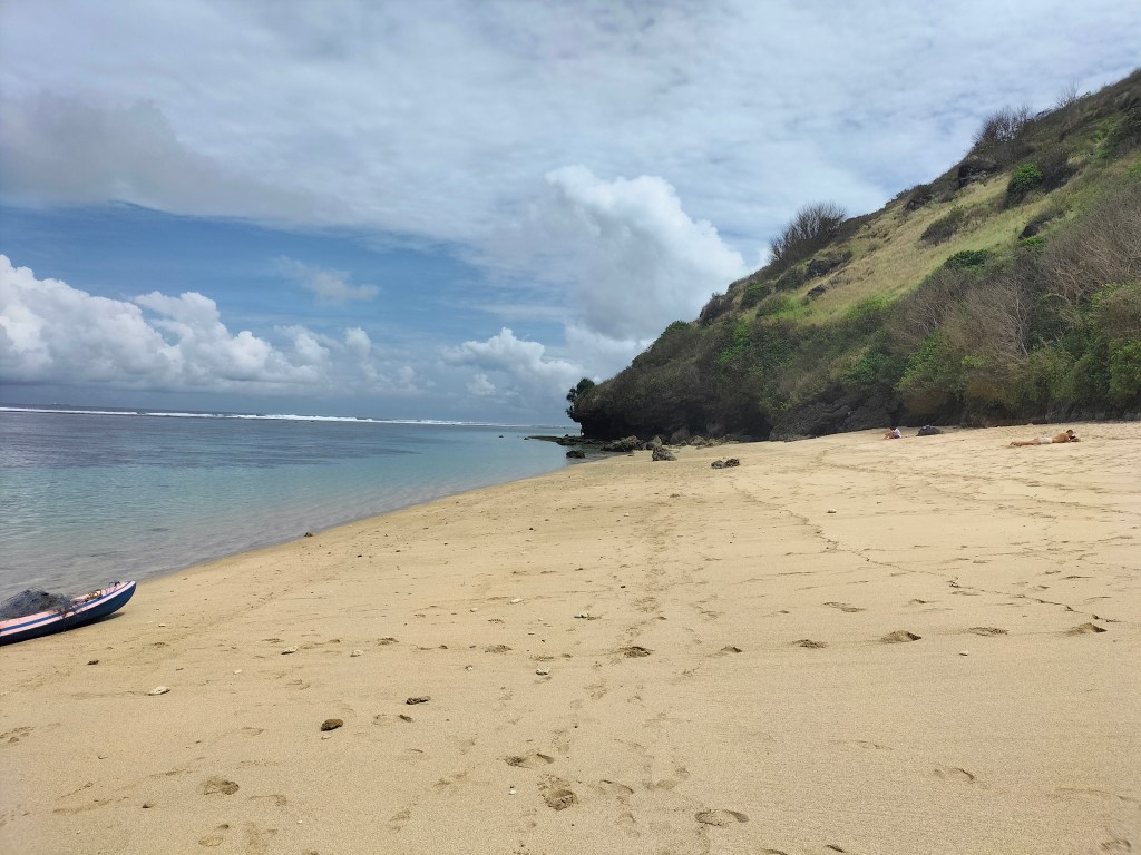 After all the stairs going down there is a warung and that was nice, the beach is quiet with only a few people sunbathing on a towel, crystal clear water and soft sand, at the end of the beach there are a few rocks on the beach and ends with a high cliff and looks a bit like the coast of Nusa Penida. A few local people rent out a canoe and walking through the shallow water looking for crabs and fish.