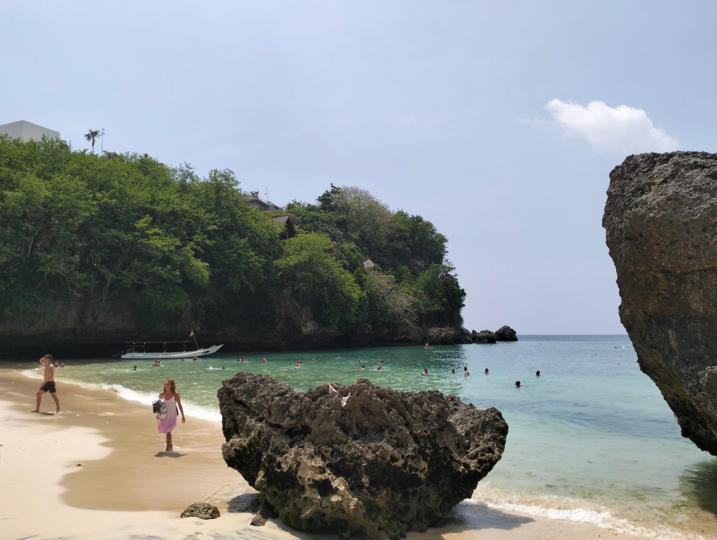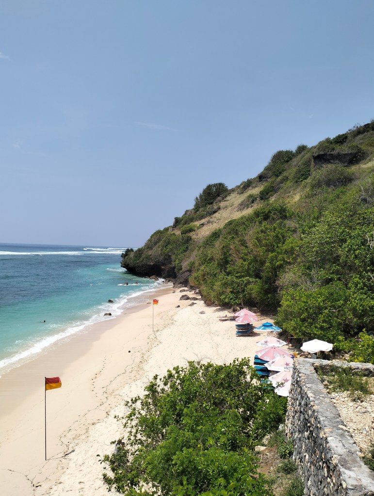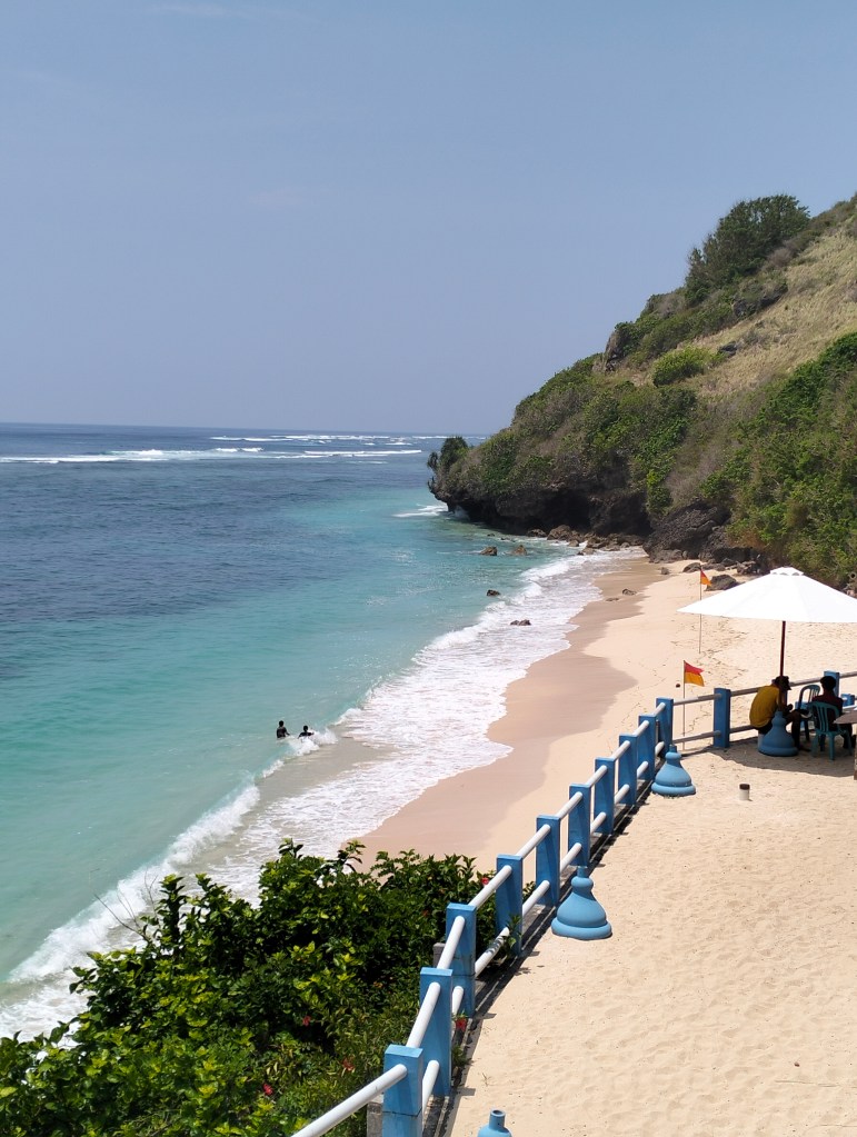 There is also a shuttle available, costs IDR 25,000, and it takes you down to the warung just above the beach, but then you miss the special system of corridors through the rocks and the open-air theater as described earlier, the stairs are the same and it was quiet at the warung (perhaps because it was still early). Compared to the first visit, the beach was now smaller, but this could also have to do with the tide and the different time of year, there are now parasols and sun loungers, not too many but that will change here too.