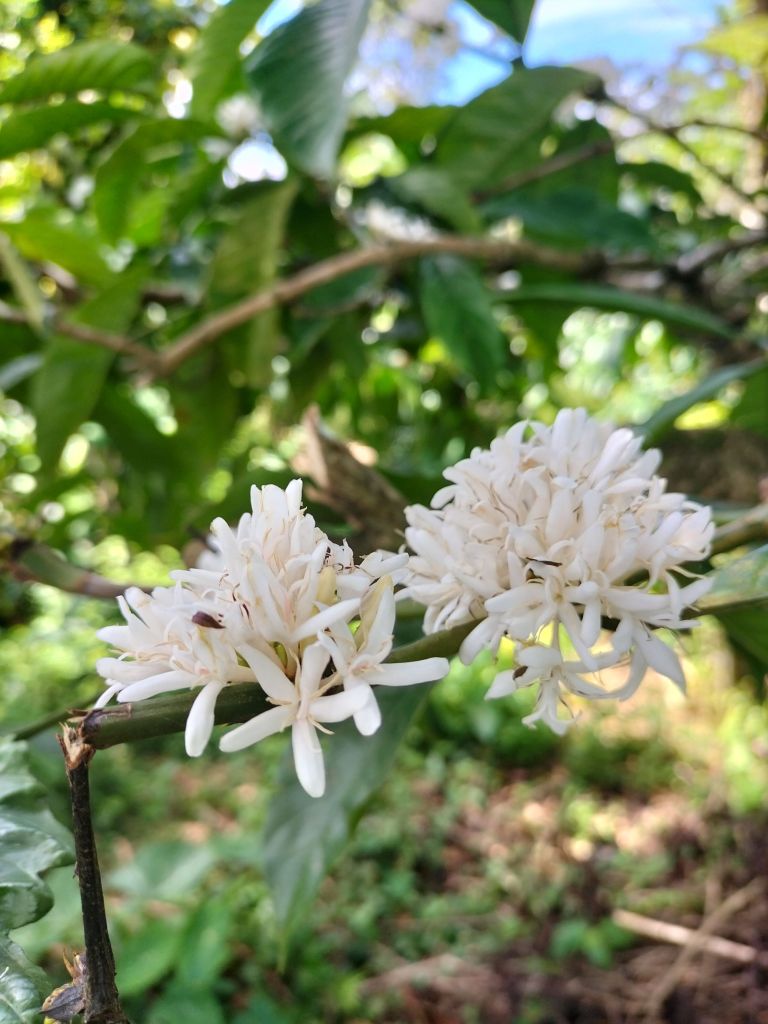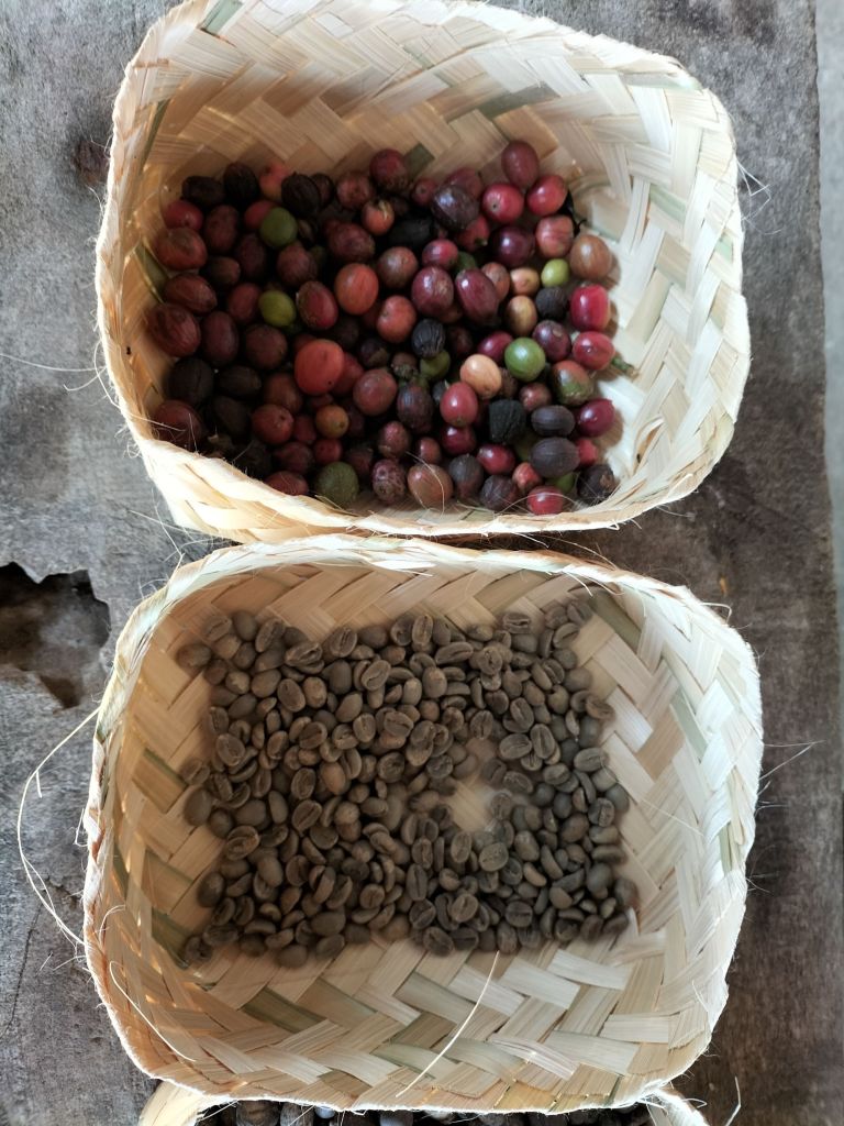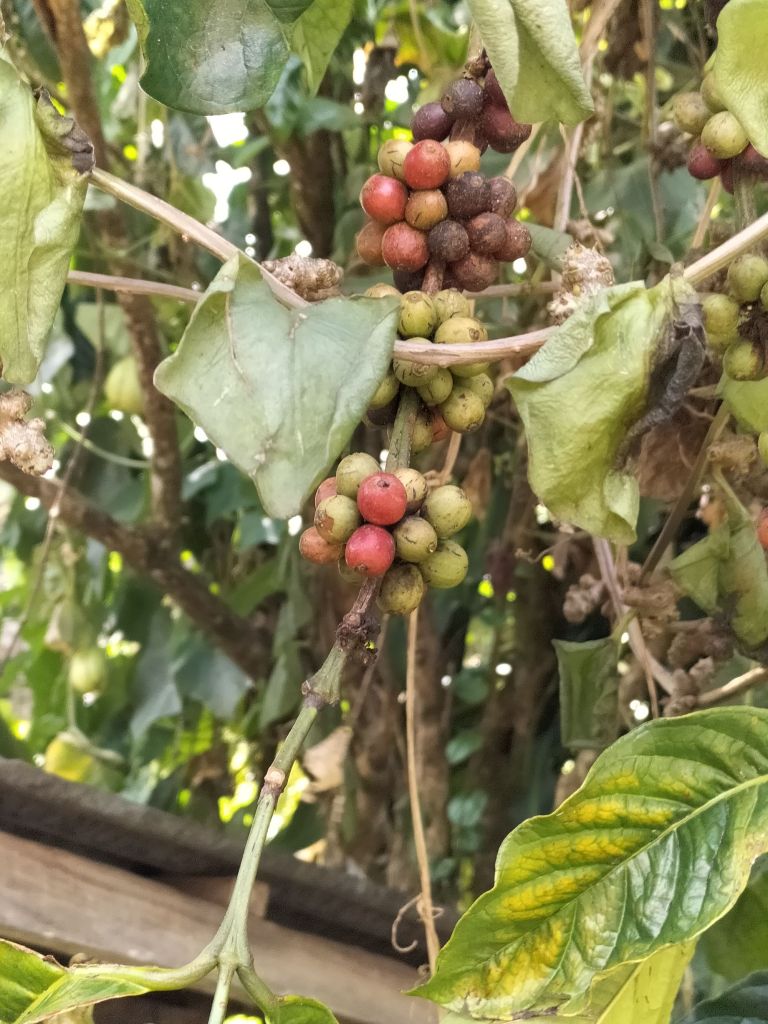 The coffee trees first give white blossom, then berries appear (in different colours), but with the harvest all berries are picked because it is too much work and takes too much time to select by colour. Later when they are picked, they often colour even more during drying.
