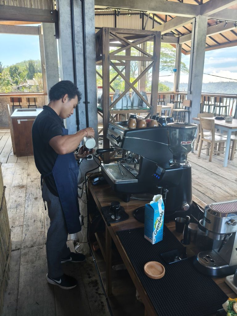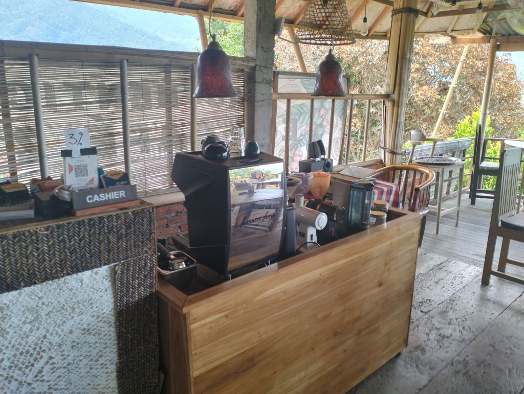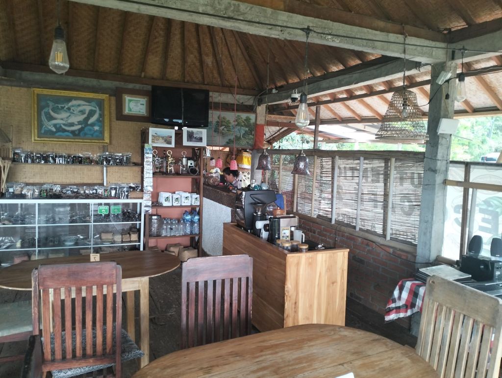 You’ll find the cafe on the side of the road at Jalan Raya Desa Munduk Dusun Beji, Munduk. Don’t worry about parking as there is a small parking lot available. On the ground floor, you can find the friendly owner roasting the coffee beans. Just go upstairs to the restaurant and enjoy the coffee, the local delicacies and the view!