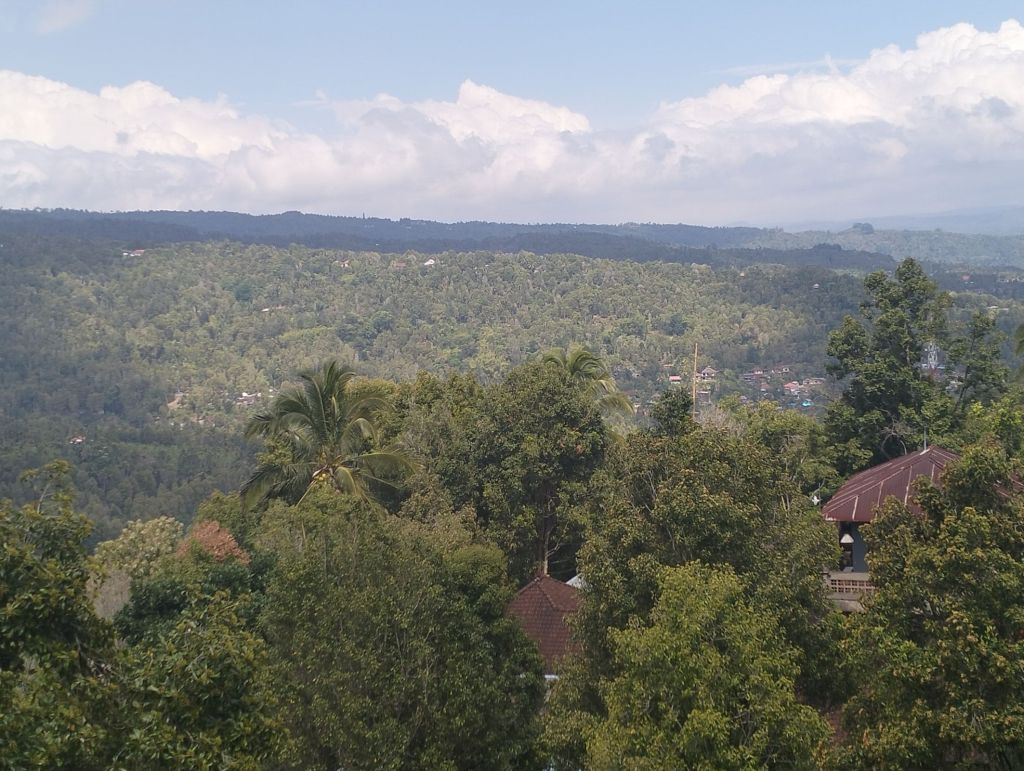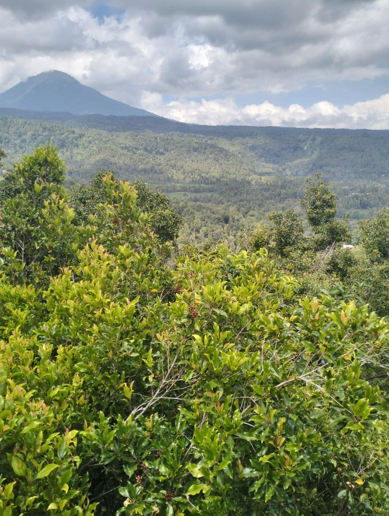 From where you sit, you can see the clove trees. In August it is harvest season, but picking the cloves is difficult because they grow so high. Harvesters must climb ladders to get them, and you’ll see the cloves laid out to dry on the side of the road all over the area.