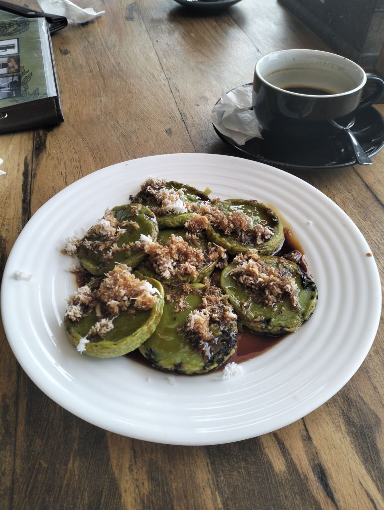 - Laklak (on the right picture above) is a Balinese traditional little pancake with grated coconut and melted palm sugar. This food is made of rice flour, water, coconut milk, suji leaf extract, baking powder, salt, grated coconut, and brown sugar. ↩︎