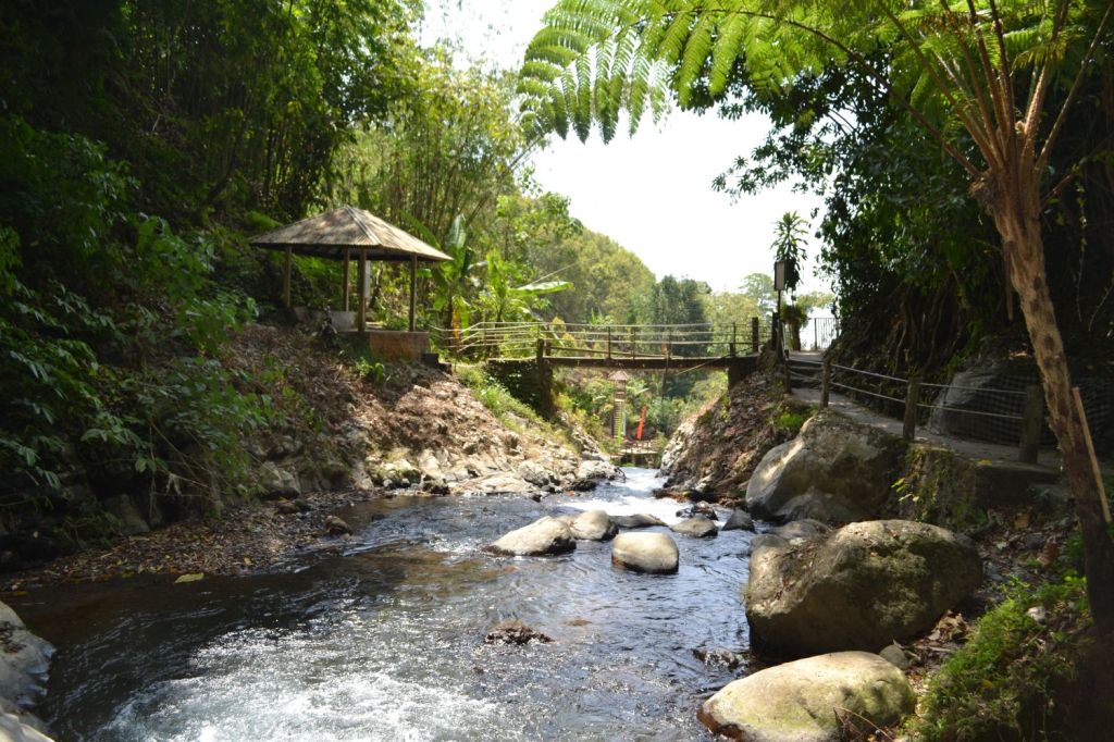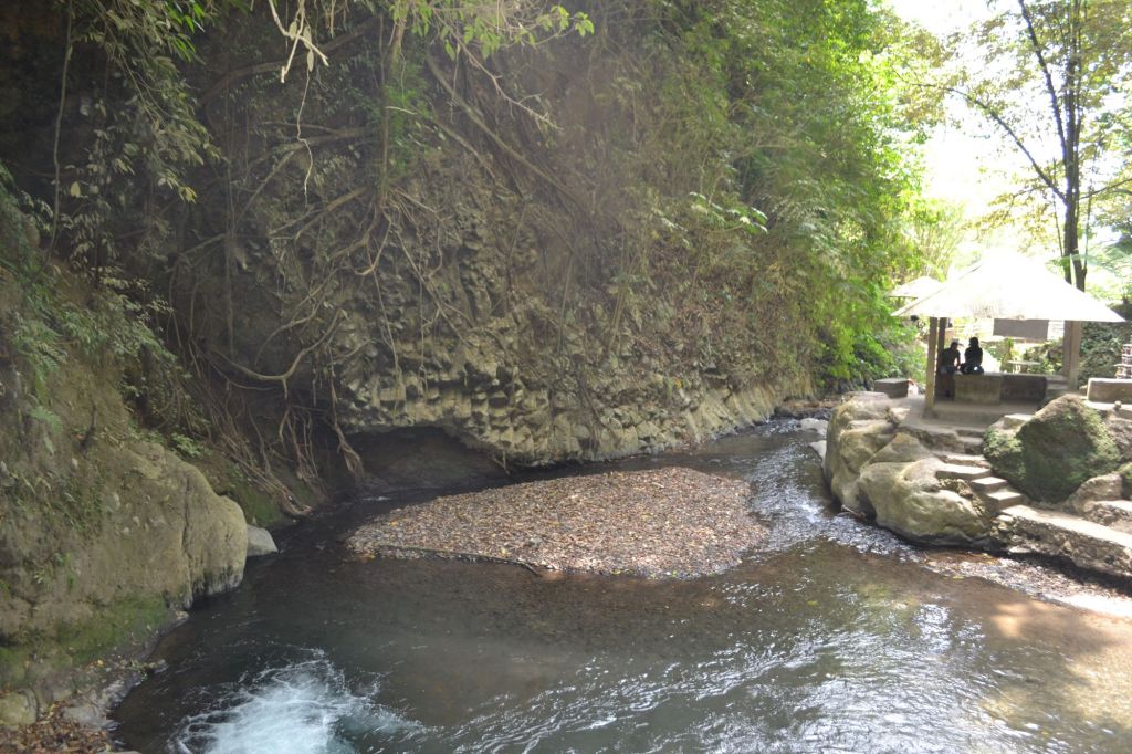 You walk about 600 meters down, sometimes with stairs, and eventually you arrive at a kind of gazebo, you go to the other side of the water using the bridge and with some clambering along the water you finally reach the point where the water goes down.
