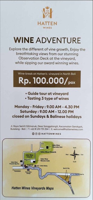 In Desa Sanggalangit (click here for the exact location) you can visit the Hatten vineyards and when you are a fan of wine it is certainly worth a visit and of course this all has to do with taste and tastes differ, one says it is not a good wine and the other says it is excellent wine. The Hatten wine is a 100% Bali wine, the grapes are grown in the vineyard, matured and bottled in the ultra-modern winery in Sanur. Our approach combines modern winemaking practices with time-honoured French techniques to ensure consistency of style and quality from harvest to harvest.
