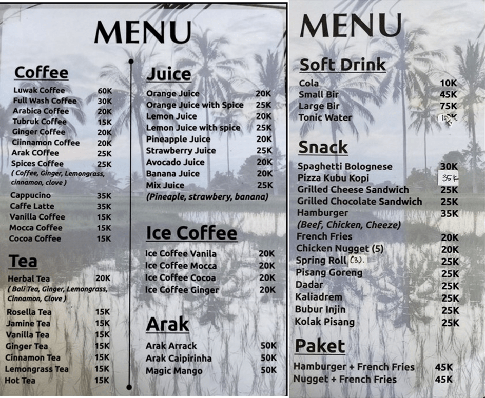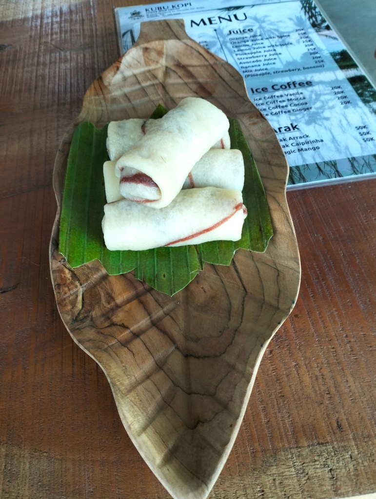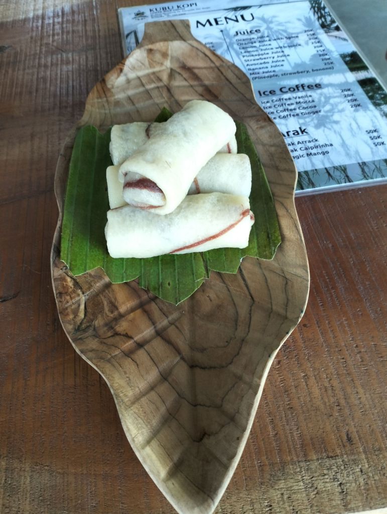 Coffee is the main thing but they also have tea and local Balinese cake called Kue Dadar, pisang goreng and spring roll. They grow the coffee on a other plantation (owned by the family). They serve the coffee and food on a nice way.