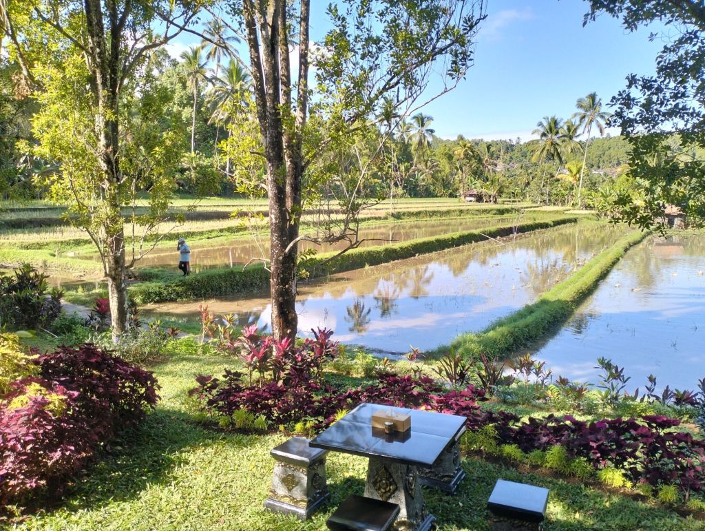 Kubu Kopi is as they call it a “Natural Place” where they have coffee and spices. For sure the location is natural surrounded by ricefields and it is very quiet and a relaxing place and the only sound you hear are the ducks in the ricefield. At the time of the first visit the fields were empty, when we visit for the second time the fields was full of rice.