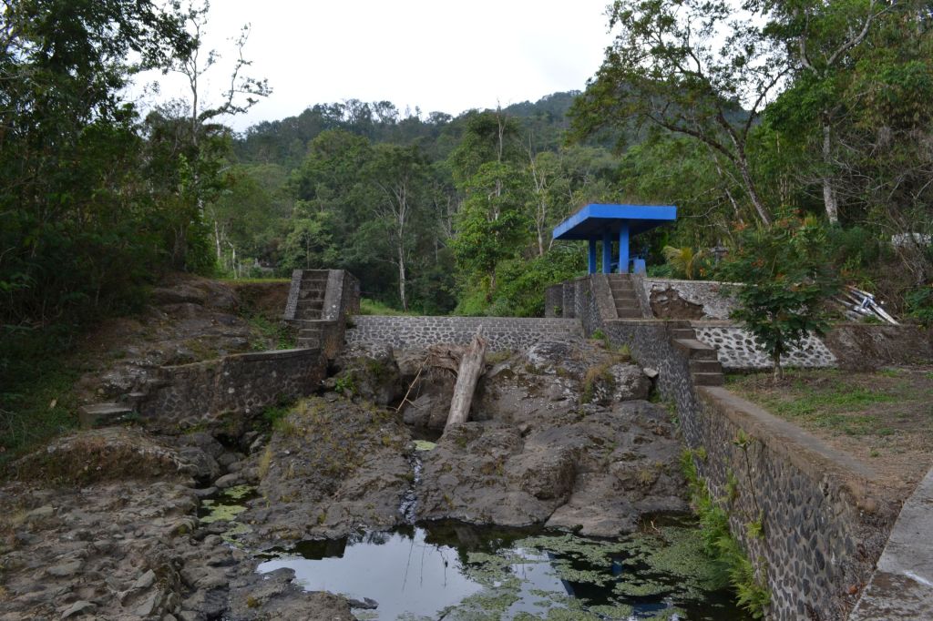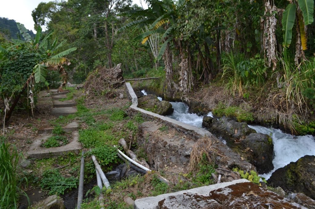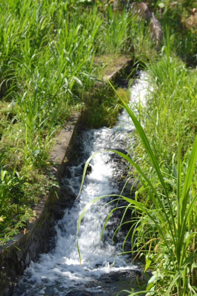 After lunch it was time to go back, via a different route, there was a lot of climbing and watch out where you walk, over bridges of 4 bamboo poles and then still loose, up to a path of a stone wall along the fast flowing water, this water leads to the electricity plant PLTMH Muara (Pembangkit Listrik Tenaga Mini Hidro).