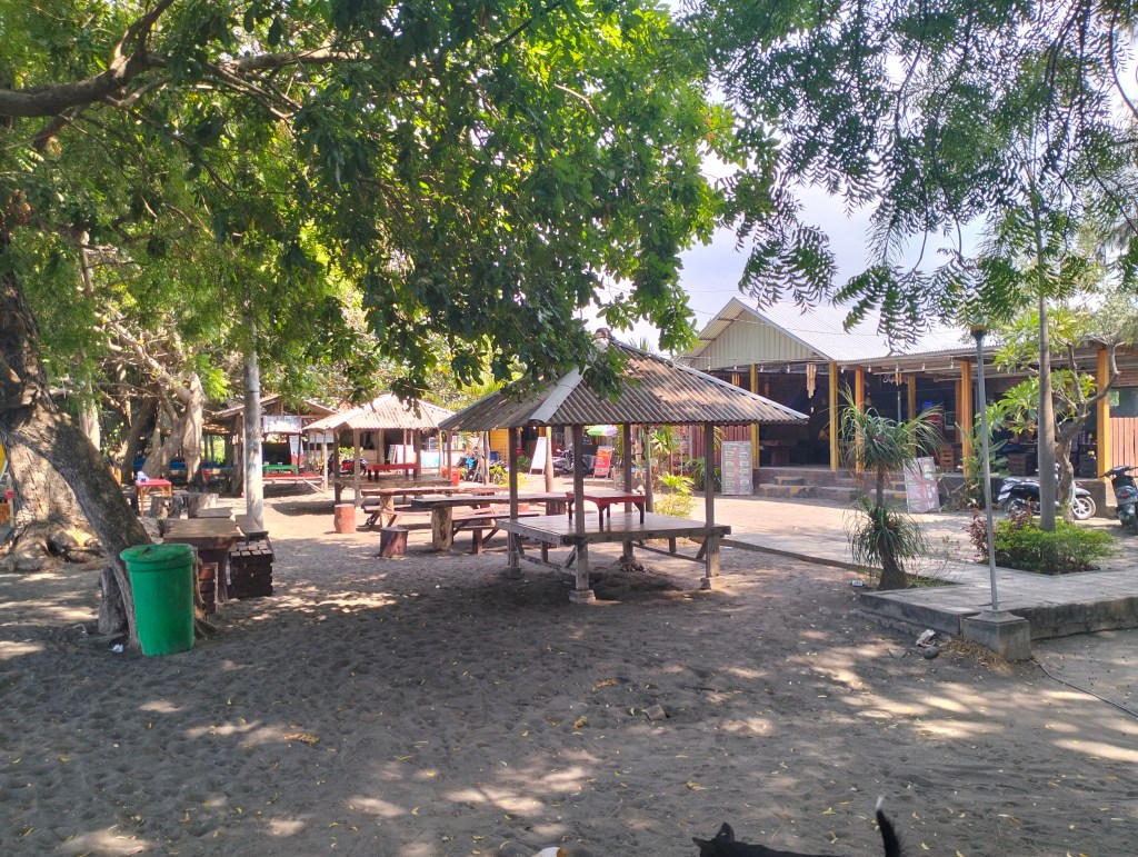 As mentioned there are several warungs and there are also gazebo’s where you can sit and where you can eat and drink but there are also some tables on the beach.