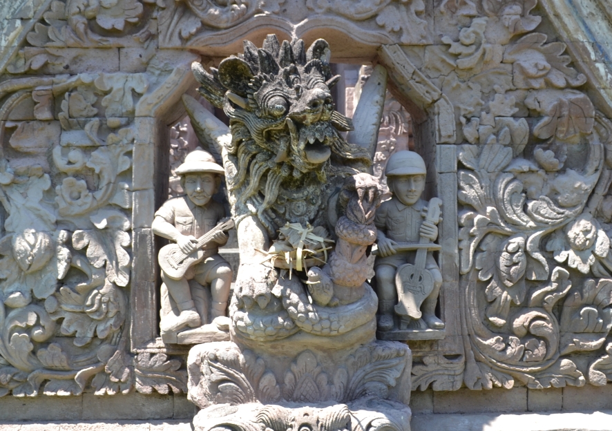 In this temple there are many statues, one of them is showing two Dutch soldiers who are depicted as musicians with a guitar and a rebab in their hands.